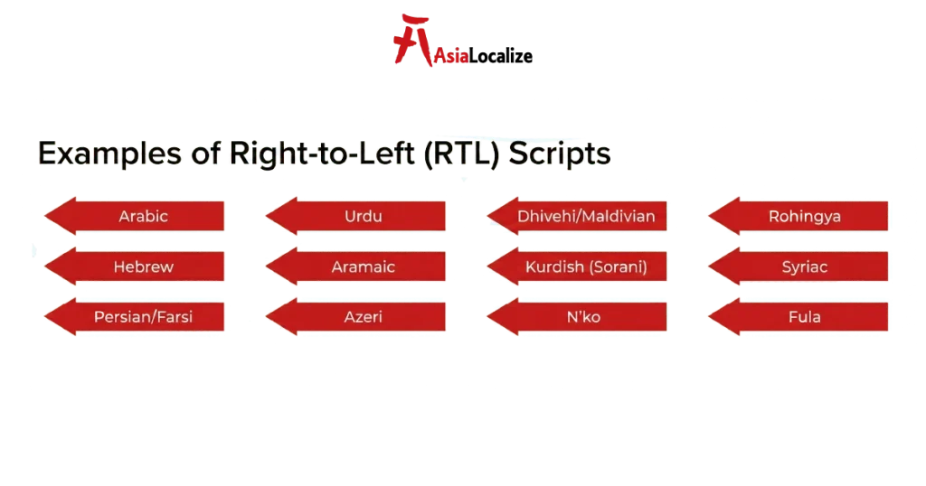 - Languages involve right-to-left layout (Arabic, Hebrew, Farsi).